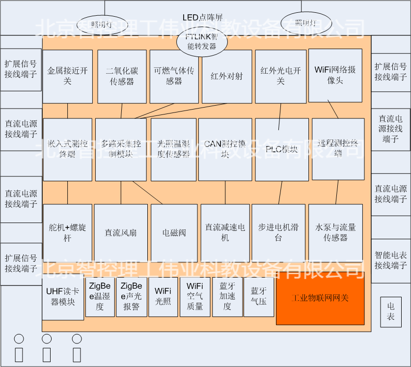 1、標配網(wǎng)孔操作板、四組直流供電板、四組有線傳感器的供電通信板、六個無線傳感器節(jié)點、一個工業(yè)物聯(lián)網(wǎng)網(wǎng)關(guān)、兩個無線強電控制插座、四種交直流電源按鈕、指示燈、點陣顯示屏等,為行業(yè)應(yīng)用創(chuàng)新設(shè)計提供硬件支持。