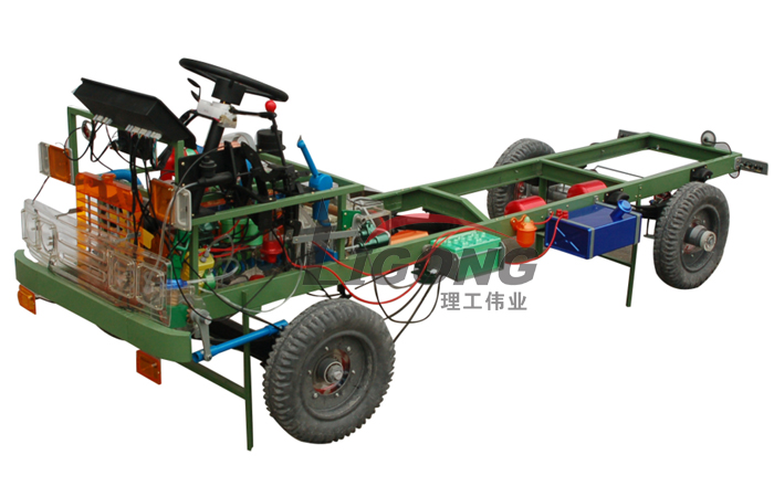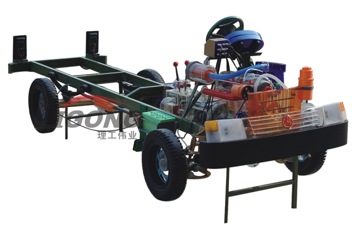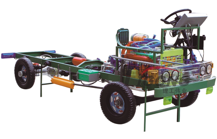 本品選用透明有機(jī)玻璃制作,內(nèi)中部件均以硬質(zhì)塑料料加工,用 螺絲固定在金屬高溫烘漆而成的車架上。各總成部分都以壓模成形加 工,代替過(guò)去膠粘合的方法,使產(chǎn)品在強(qiáng)度上有很大提高。發(fā)動(dòng)機(jī)總成用電機(jī)驅(qū)動(dòng),在油門處設(shè)有調(diào)速裝置,能演示發(fā)動(dòng)機(jī)轉(zhuǎn)速高低。離合器分離明顯,操縱靈活,離合器外殼整體壓模而成,變速箱和各檔齒輪用各種顏色表示,換檔靈活,手制動(dòng)美觀。后橋外形壓模而成,內(nèi)中主減速、差速轉(zhuǎn)動(dòng)自如,輪轂剎蹄壓模成型,剎蹄可調(diào)節(jié),前橋輪鼓可調(diào)整,轉(zhuǎn)向裝置以及電瓶、油箱、水箱,制動(dòng)管路分布清楚一目了然。電路采用對(duì)插件前后分布,燈架、風(fēng)窗、儀表板、后燈架用透明有機(jī)玻璃壓模成整體美觀逼真。