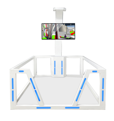 1、包含顯示屏幕、主機(jī)、頭戴設(shè)備、行走平臺(tái)、護(hù)欄等。