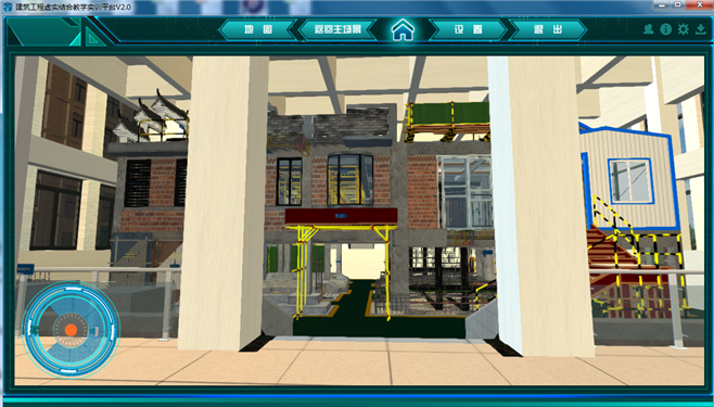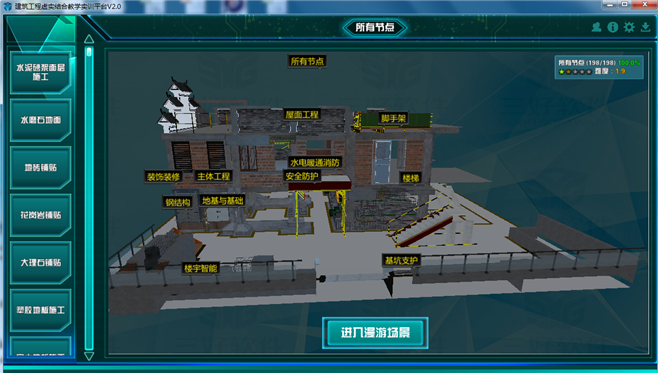 2. 建筑工程虛擬仿真教學(xué)軟件系統(tǒng)可通過漫游模式或點擊對應(yīng)菜單進(jìn)入仿真程序,并在進(jìn)入程序后可進(jìn)行相互切換。