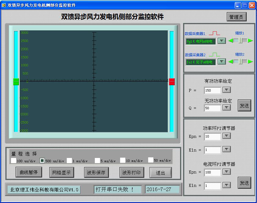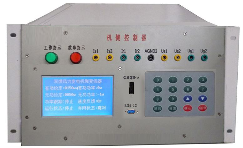 機(jī)側(cè)控制器的作用主要有兩個(gè)方面,一是給雙饋發(fā)電機(jī)的轉(zhuǎn)子提供勵(lì)磁分量的電流,從而可以調(diào)節(jié)雙饋發(fā)電機(jī)的定子側(cè)所發(fā)出的無功功率;二是通過控制雙饋發(fā)電機(jī)轉(zhuǎn)子轉(zhuǎn)矩分量的電流控制發(fā)電機(jī)的轉(zhuǎn)速或控制發(fā)電機(jī)定子側(cè)所發(fā)出的有功功率,從而使發(fā)電機(jī)運(yùn)行在風(fēng)力機(jī)的*佳功率曲線上,實(shí)現(xiàn)*大風(fēng)能追蹤(捕獲)運(yùn)行。機(jī)側(cè)控制器面板安裝有兩個(gè)信號指示燈,16鍵PVC軟鍵盤,240*128點(diǎn)蘭色液晶屏及9個(gè)波形測試端子。信號指示燈可對控制器工作、保護(hù)狀態(tài)分別指示;鍵盤可完成機(jī)側(cè)控制器啟動(dòng)/停止設(shè)置,*大功率啟動(dòng)/停止跟蹤設(shè)置,有功/無功給定,手動(dòng)并網(wǎng)/離網(wǎng);液晶屏可顯示轉(zhuǎn)速反饋值,有功/無功反饋值;波形測試端子可通過示波器觀測發(fā)電機(jī)機(jī)轉(zhuǎn)子、定子相電流波形,可觀測發(fā)電機(jī)定子相電壓、電網(wǎng)相電壓波形。
