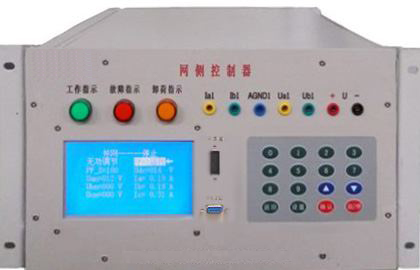 網(wǎng)側(cè)控制器面板安裝有三個(gè)信號(hào)指示燈,16鍵PVC軟鍵盤,240*128點(diǎn)蘭色液晶屏及7個(gè)波形測(cè)試端子。信號(hào)指示燈可對(duì)控制器工作、故障、卸荷狀態(tài)分別給于指示,通過(guò)鍵盤可完成并網(wǎng)啟動(dòng)/停止設(shè)置。液晶屏可完成三相電流,電壓有效值顯示,直流母線電壓顯示;面板觀測(cè)孔可觀測(cè)電網(wǎng)相電流波形、相電壓波形及直流母線電壓波形。