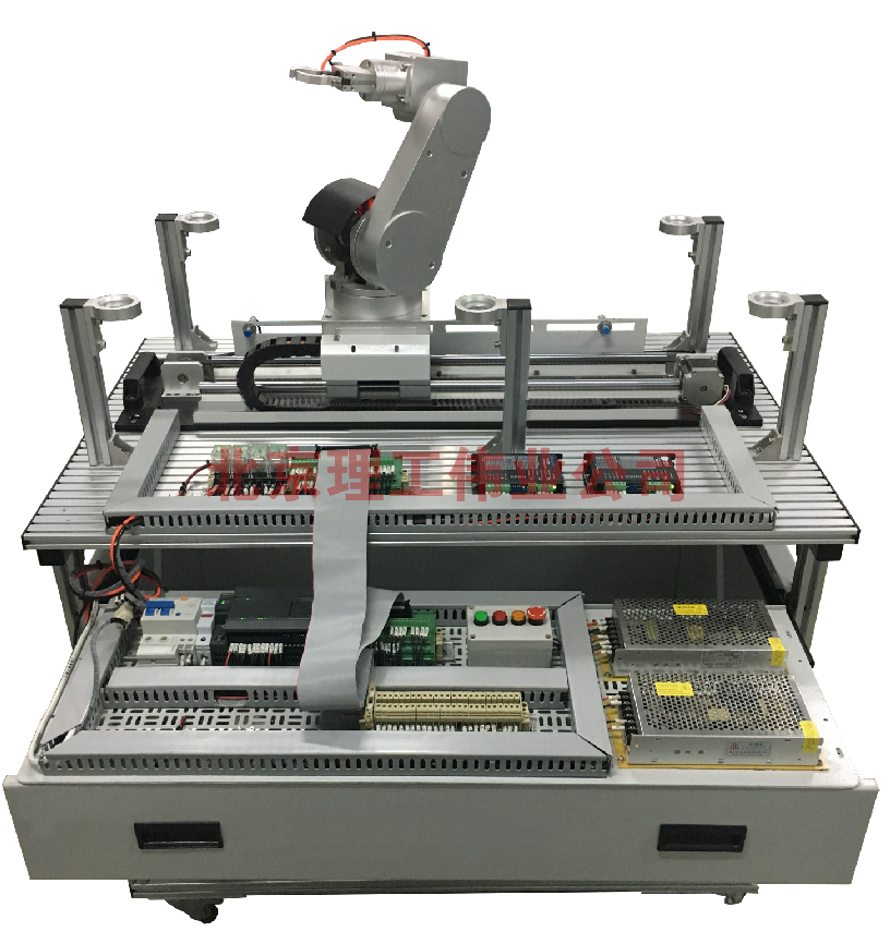 LGWD-05型 五自由度機(jī)器人實(shí)訓(xùn)平臺由型材實(shí)訓(xùn)桌、五自由度機(jī)器人、機(jī)器人控制器、步進(jìn)電機(jī)及驅(qū)動(dòng)器和電氣控制部分組成。通過PLC、機(jī)器人控制器對五自由度機(jī)器人進(jìn)行控制,實(shí)現(xiàn)機(jī)器人在行程范圍內(nèi)任一位置物體的抓取、移動(dòng)、存放功能。適合自動(dòng)檢測技術(shù)、信號連接及轉(zhuǎn)換技術(shù)、電機(jī)驅(qū)動(dòng)技術(shù)、機(jī)械手技術(shù)、機(jī)器人技術(shù)、運(yùn)動(dòng)控制技術(shù)、傳感器檢測技術(shù)、位置檢測技術(shù)、電氣及PLC控制技術(shù)、可編程控制器及其應(yīng)用等。