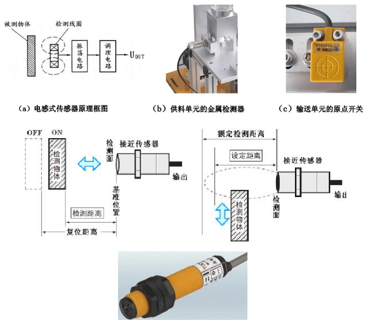 電感式接近開關(guān)是利用電渦流效應(yīng)制造的傳感器。電渦流效應(yīng)是指當金屬物體處于一個交變的磁場中,在金屬內(nèi)部會產(chǎn)生交變的電渦流,該渦流又會反作用于產(chǎn)生它的磁場這樣種物理效應(yīng)。如果這個交變的磁場是由一個電感線圈產(chǎn)生的,則這個電感線圈中的電流就會發(fā)生變化,用于平衡渦流產(chǎn)生的磁場。利用這一原理,以高頻振器(LC振蕩器)中的電感線圈作為檢測元件,當被測金屬物體接近電感線圈時產(chǎn)生了渦流效應(yīng),引起振蕩器振幅或頻率的變化,由傳感器的信號調(diào)理電路(包括檢波、放大、整形、輸出等電路)將該變化轉(zhuǎn)換成開關(guān)量輸出,從而達到檢測目的。電感式接近傳感器工作原理框圖如圖2-14 (a)
