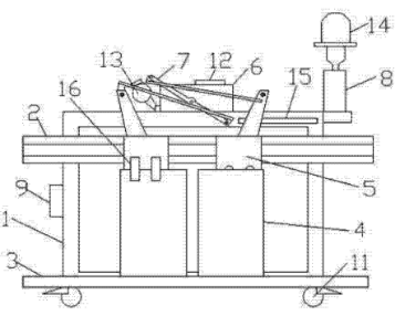 如圖1和圖2所示,一種電梯門機(jī)實(shí)訓(xùn)裝置,包括架體1,架體1上下分別固定門導(dǎo)軌2和地坎3,兩個(gè)轎門4頂部分別通過門刀16和門掛板組件5連接在門導(dǎo)軌2上,轎門4底部卡接在地坎3上,轎門4的門掛板組件5頂部通過連桿機(jī)構(gòu)7與設(shè)置在架體1頂部的門機(jī)減速裝置6和電機(jī)13相連,門機(jī)減速裝置6設(shè)置門機(jī)控制器12,架體1的底架上設(shè)置配重塊10,架體1頂部設(shè)置照明燈14和手動(dòng)控制機(jī)構(gòu)8,架體1上設(shè)置一個(gè)電源9,架體1底部設(shè)置萬向輪11,轎門4頂部的架體上安裝有到位開關(guān)15。