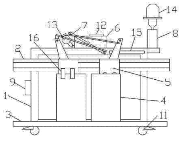 圖中1架體、2門導(dǎo)軌、3地坎、4轎門、5門掛板組件、6門機(jī)減速裝置、7連桿機(jī)構(gòu)、8手動(dòng)控制機(jī)構(gòu)、9電源、10配重塊、11萬向輪、12門機(jī)控制器、13電機(jī)、14照明燈、15到位