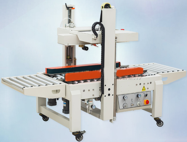 自動封箱機(jī)可一次完成上下封箱動作,采用印字膠帶,更可提高產(chǎn)品形象。左右驅(qū)動系統(tǒng)確保重紙箱輸送,機(jī)芯上下可互換,皮帶的張力、膠粘帶張力調(diào)整容易,可適用于軟硬紙箱,可單機(jī)也可流水線使用。