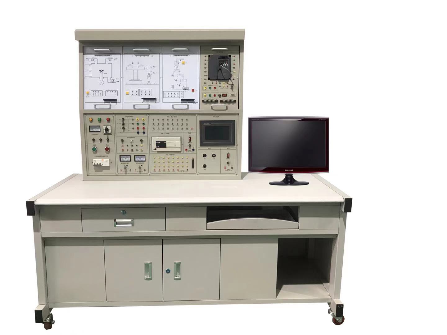 PLC可編程控制器實(shí)驗(yàn)裝置由控制屏、實(shí)訓(xùn)桌、PLC主機(jī)實(shí)訓(xùn)組件、PLC實(shí)訓(xùn)模塊、變頻器掛箱、觸摸屏掛箱、交直流電機(jī)、總線單元、通信模塊、電機(jī)導(dǎo)軌、測速機(jī)構(gòu)等組成。