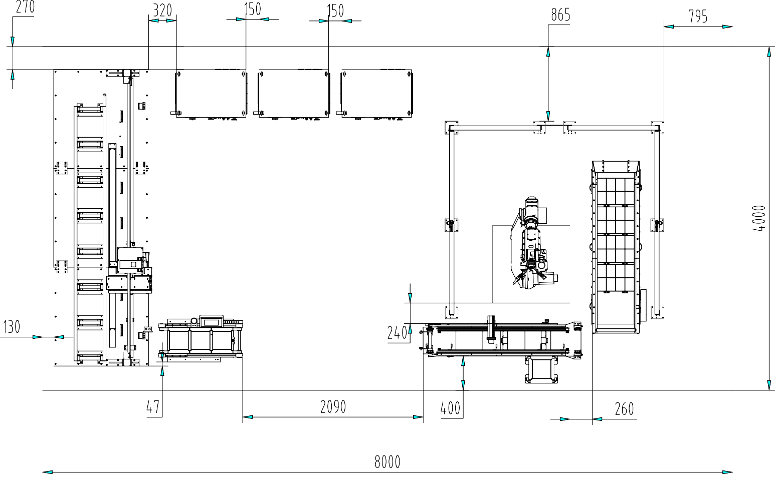 本設(shè)備共包括:工業(yè)機(jī)器人及控制柜、PLC 控制柜、托盤流水線、物品盒擺放流水線、AGV 小車等。比賽所用場(chǎng)地為 4m×8m,如圖 2-1 所示為裝備之間的大致布局,現(xiàn)場(chǎng)安裝時(shí)并不一定嚴(yán)格按照?qǐng)D中所標(biāo)尺寸安裝,允許有所變動(dòng)。在安裝時(shí)需要注意以下事項(xiàng):