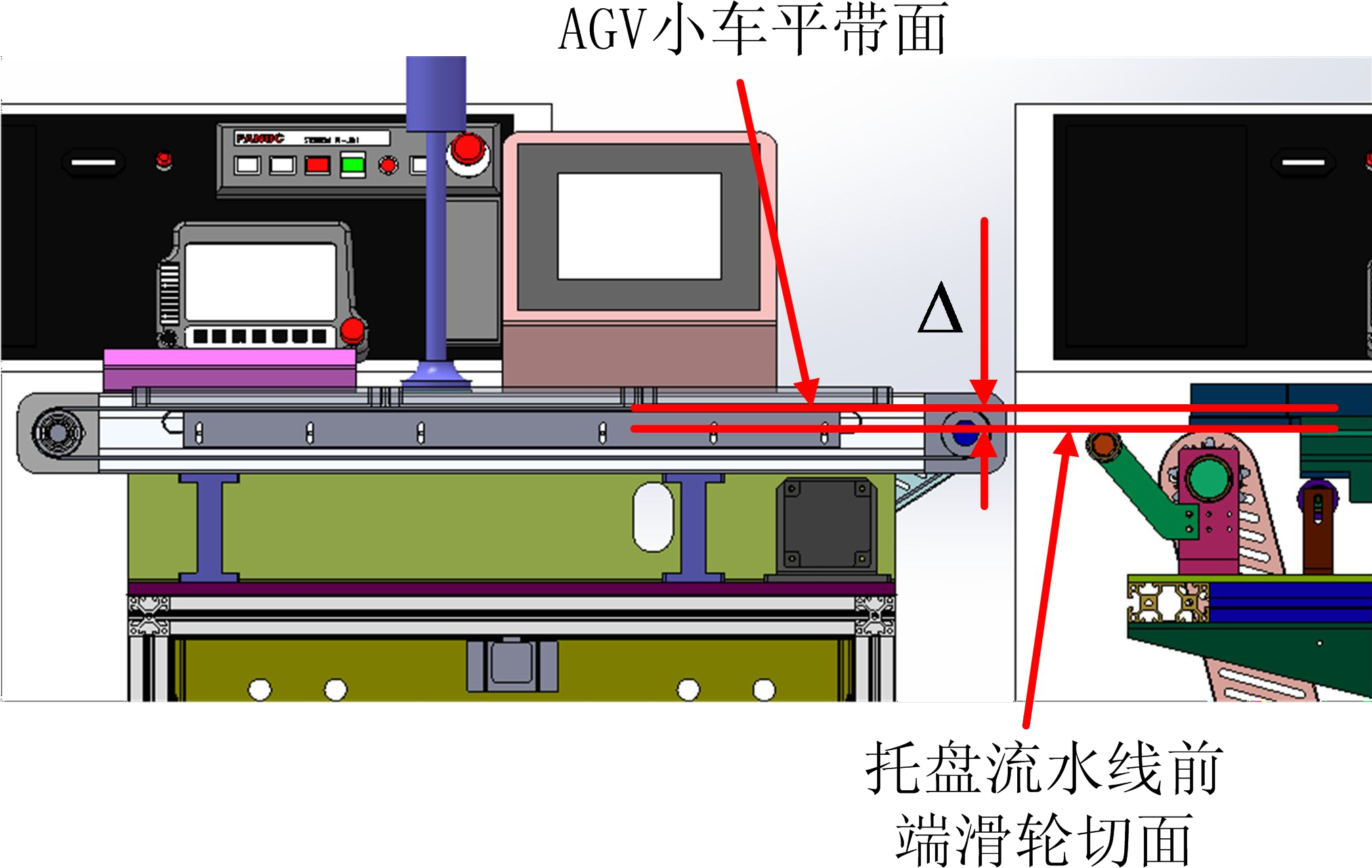 (4) 確保托盤流水線前端滑輪的平切面低于AGV 小車的平帶面;(見圖 2-2)。