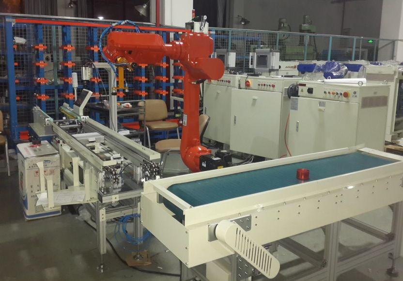 本系統(tǒng)中6自由度工業(yè)機(jī)器人負(fù)責(zé)把托盤流水線上托盤中的貨品抓取到,根據(jù)規(guī)定的目標(biāo)物品盒,放入到相應(yīng)的位置。機(jī)械手裝載貨品限定在5工位的中間工位。如需裝載左右物品盒,通過左右移位將邊上的物品盒移到中間工位。