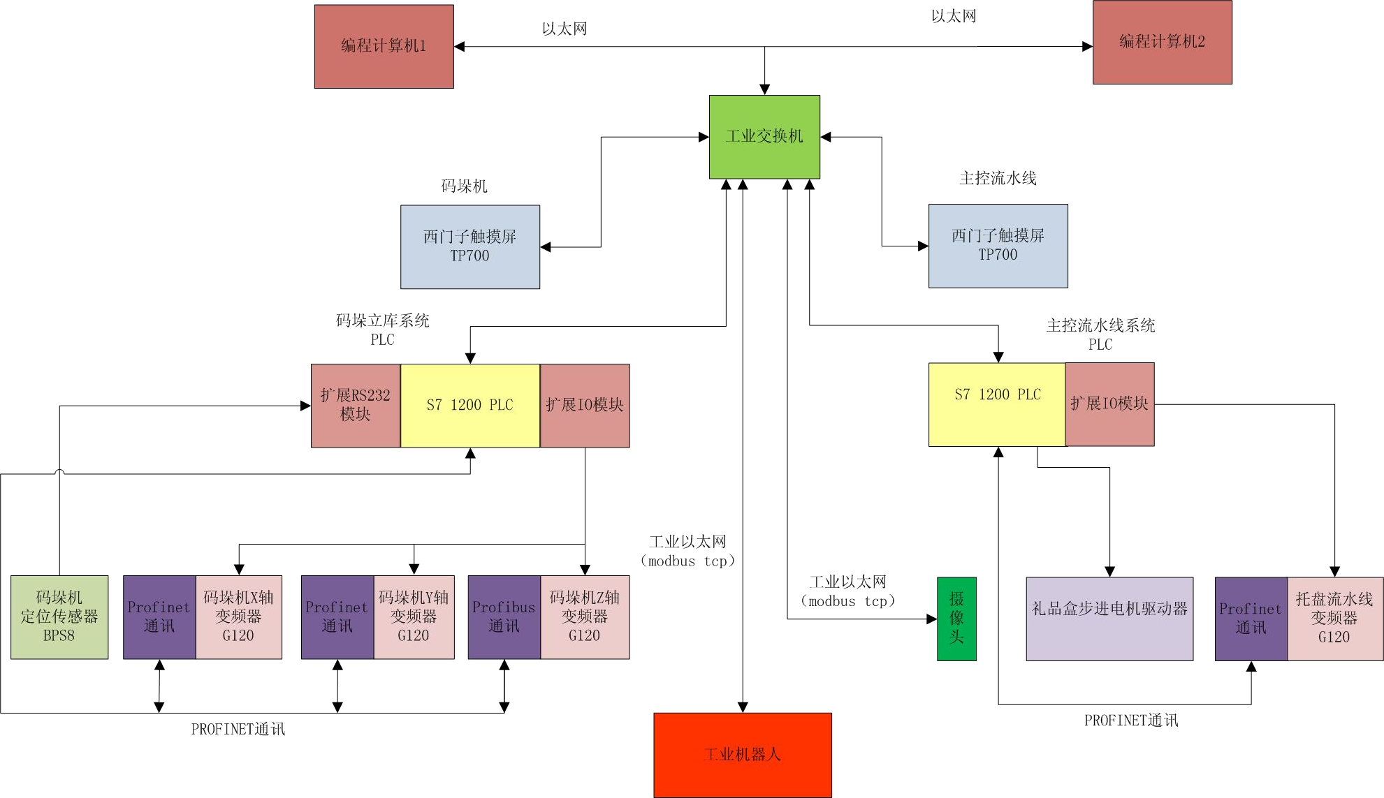 如上圖所示,整個(gè)系統(tǒng)通過工業(yè)以太網(wǎng)總線,把工業(yè)機(jī)器人、主控流水線 PLC、碼垛機(jī)立庫系統(tǒng) PLC、碼垛機(jī)立庫系統(tǒng)觸摸屏、主控流水線觸摸屏、視覺系統(tǒng)、變頻器以及編程開發(fā)計(jì)算機(jī)等均通過以太網(wǎng)連接。編程開發(fā)計(jì)算機(jī)負(fù)責(zé)開發(fā)調(diào)試程序、視覺系統(tǒng)特征識(shí)別開發(fā)以及機(jī)器人示教等編程。碼垛立庫系統(tǒng)和主控流水線觸摸屏負(fù)責(zé)管理碼垛立庫系統(tǒng)、主控流水線的運(yùn)行參數(shù),以及系統(tǒng)報(bào)警和提示信息等。