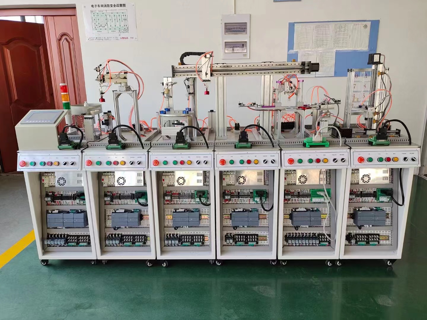 LG-MPS06型 模塊式柔性自動化生產(chǎn)線實訓(xùn)系統(tǒng)是一種最為典型的機電一體化、自動化類產(chǎn)品,它是為職業(yè)院校、教育培訓(xùn)機構(gòu)等而研制的,它適合機械制造及其自動化、機電一體化、電氣工程及自動化、控制工程、測控技術(shù)、計算機控制、自動化控制等相關(guān)專業(yè)的教學(xué)和培訓(xùn)。它接近工業(yè)生產(chǎn)制造現(xiàn)場基礎(chǔ)上雙針對實訓(xùn)教學(xué)進行了專門設(shè)計,強化了各種控制和工程實踐能力。系統(tǒng)包含了機電一體化專業(yè)中的氣動、電機驅(qū)動與控制、PLC、變頻器、觸摸屏、傳感器等多種控制技術(shù),適合相關(guān)專業(yè)學(xué)生進行工程實踐、課程設(shè)計及初上崗位的工程技術(shù)人員進行培訓(xùn)。