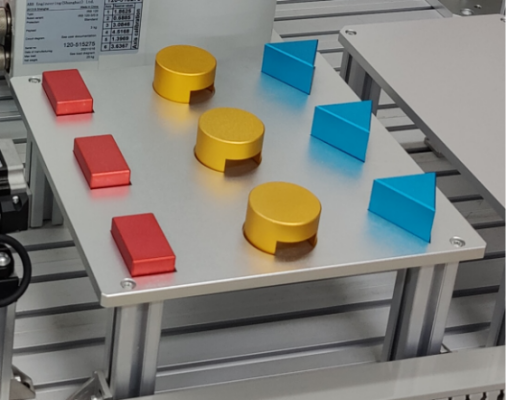 4、工業(yè)機器人末端安裝電磁吸盤,可匹配多種夾具。同時至少配備4種工裝夾具,夾具有專門的工具架安放,每個夾具的負重至少在3kg以上。按照實訓項目的要求可分別配合工業(yè)機器人完成物料夾取、軌跡模擬、寫字繪圖等工作。