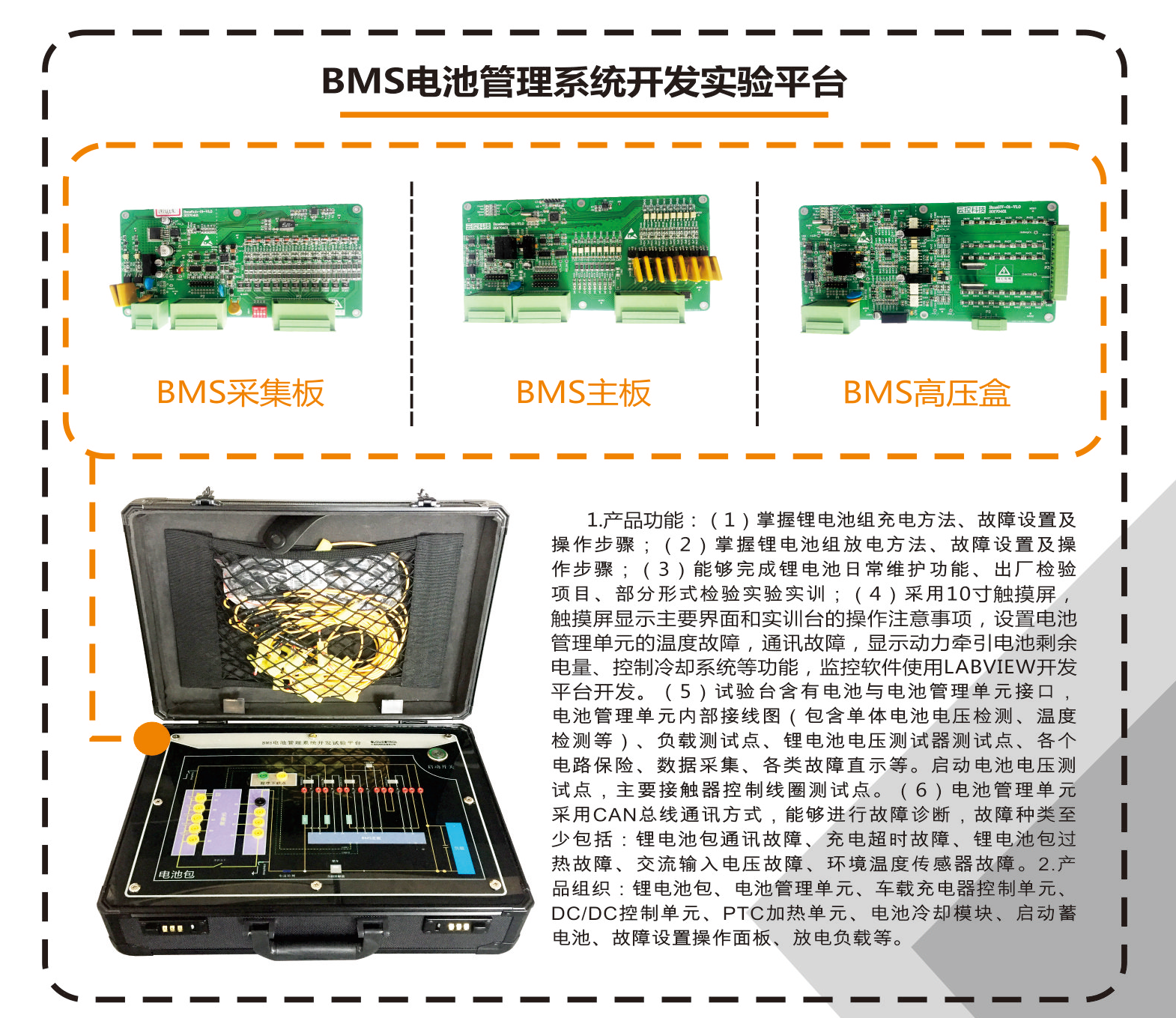 BMSPACK組裝實驗臺 技術(shù)要求: 1. 實訓(xùn)臺采用高性能嵌入式數(shù)字電池電路板,故障模擬板,ARM核心主控板,車用磷酸鐵鋰動力電池,臺架動力電池組采用24節(jié)單體電池串聯(lián)組...