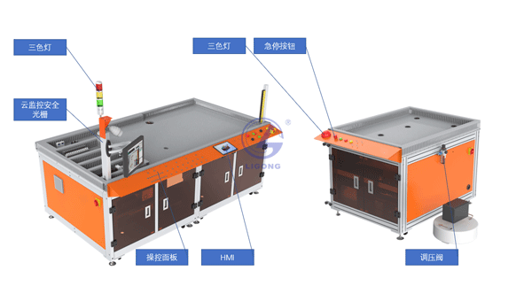 設(shè)備架體用于支持各單元,上臺(tái)面為型材臺(tái)面,各單元可方便在臺(tái)面安裝。具有腳輪,可用于移動(dòng)設(shè)備。上面安裝有云監(jiān)控安全光柵、三色燈,另一臺(tái)架控制面板上也具有三色燈,用于顯示協(xié)作機(jī)器人運(yùn)行狀態(tài)??刂泼姘灏惭b有急停開關(guān),可在緊急情況下快速停止設(shè)備。架體前方可開門,可放置工具、行星裝配模塊、2D軌跡訓(xùn)練單元、3D軌跡訓(xùn)練單元等物品。如圖所示。