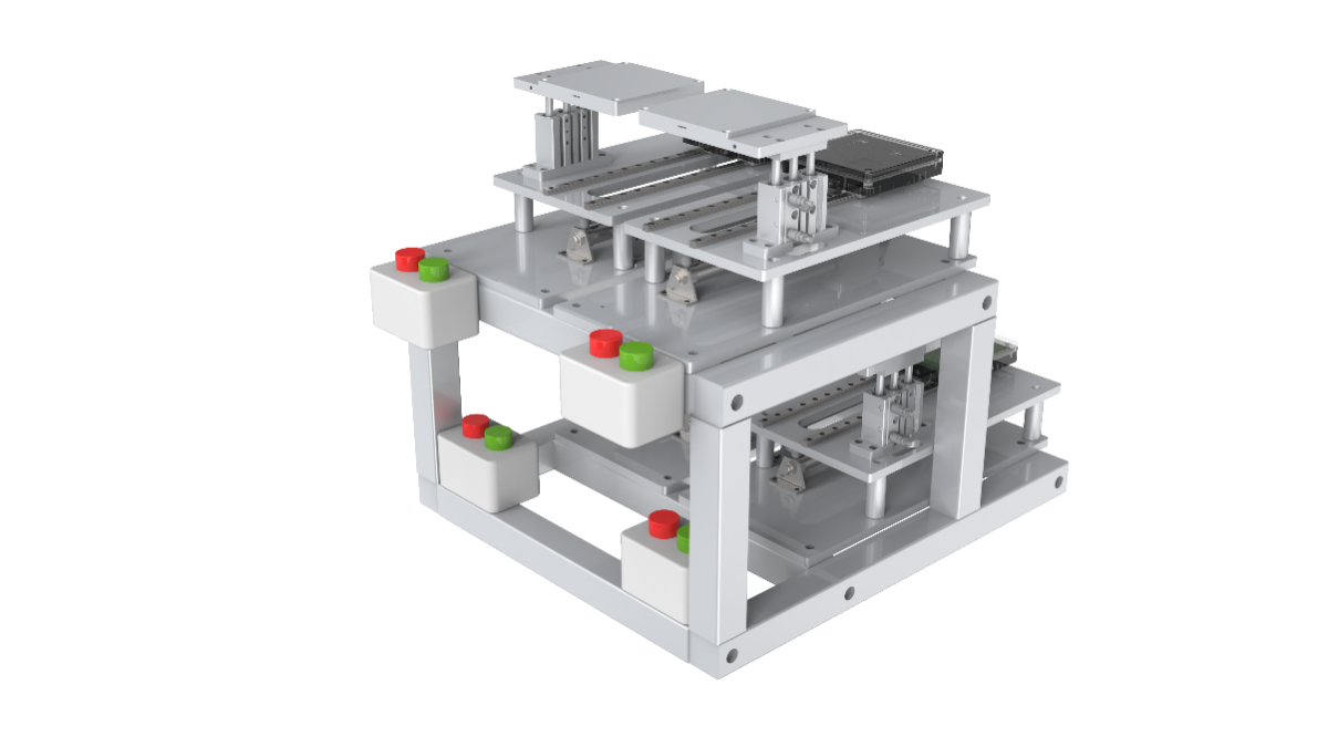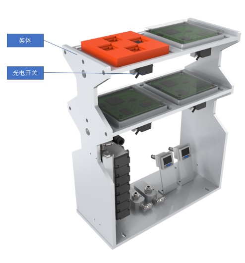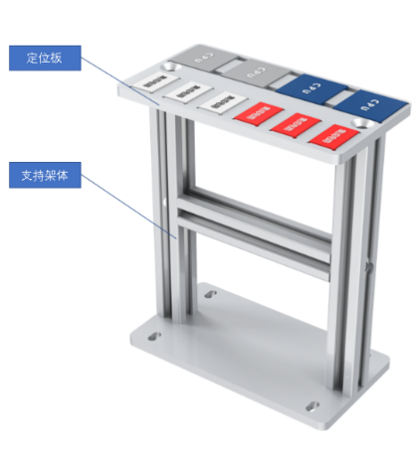 緩存單元是機(jī)器人將分揀后的芯片放入定位板內(nèi);可以根據(jù)需求設(shè)定,讓機(jī)器人取揀選不同的芯片放至對(duì)應(yīng)的槽位。由支撐架體、定位板等組成。如圖所示。