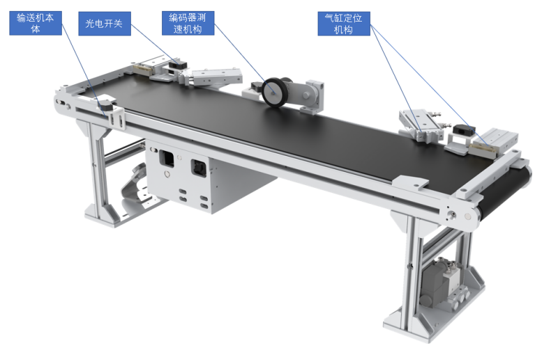 皮帶輸送單元是設(shè)備的重要組成部分,負(fù)責(zé)接駁CPU托盤的運(yùn)輸,包括輸送機(jī)本體、氣缸定位機(jī)構(gòu)、編碼器測(cè)速機(jī)構(gòu)、光電開關(guān)等組件構(gòu)成,如圖所示。芯片托盤在兩端位置可以用氣缸定位機(jī)構(gòu)定位,方便機(jī)器人精準(zhǔn)上料,編碼器可以實(shí)時(shí)測(cè)得皮帶線速度,以結(jié)合機(jī)器人和視覺相機(jī)進(jìn)行動(dòng)態(tài)抓取及物料識(shí)別。側(cè)面具有光電開關(guān),可檢測(cè)芯片托盤位置。如圖所示