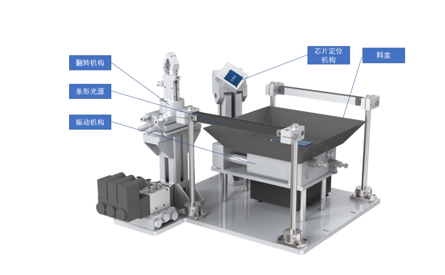 芯片供料單元由料盒、翻轉(zhuǎn)機(jī)構(gòu)、芯片定位機(jī)構(gòu)、條形光源等組成。芯片可以在翻轉(zhuǎn)機(jī)構(gòu)上進(jìn)行正反方向改變,料盒振動(dòng)功能,由氣缸伸縮實(shí)現(xiàn)??蓪?shí)現(xiàn)芯片的重新排列。料盒兩側(cè)具有條形光源,可補(bǔ)償外部環(huán)境對(duì)于視覺的干擾。芯片定位機(jī)構(gòu)是利用芯片的自重可進(jìn)行二次定位,以便于協(xié)作機(jī)器人精準(zhǔn)取放。如圖所示