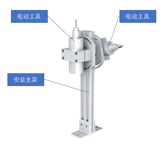 加工單元由安裝架體、銑刀電動(dòng)工具、打磨電動(dòng)工具等組成,可對(duì)零件表面進(jìn)行銑削以及打磨,并且兩個(gè)工具都可以調(diào)整角度,方便與機(jī)器人進(jìn)行角度配合。非常詳細(xì)的展示實(shí)際生產(chǎn)中這兩種不同的加工工藝,極大的加深了學(xué)生對(duì)兩種工藝?yán)斫夂驼J(rèn)知。如圖所示。