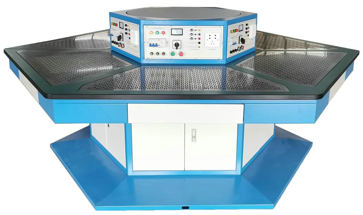 2、六邊形電源控制屏:電源控制屏采用六邊形結(jié)構(gòu),與工作臺相對應(yīng)??蚣懿捎脙?yōu)質(zhì)鞍鋼盒裝鋼板,經(jīng)過機(jī)械加工成型,外表面噴涂彩色環(huán)氧聚塑。六個作業(yè)面配置有實訓(xùn)電源及主機(jī)控制系統(tǒng),控制面板具有漏電保護(hù)、短路保護(hù)功能。電源控制屏頂面采用10mm厚的鋁框包邊,內(nèi)置有直徑為850mm的多角度公共操作平臺,公共操作平臺能360°旋轉(zhuǎn),能做120°定位,平臺頂板采用10mm厚的鋁板加工成型,能載重約60Kg的典型工作任務(wù)。