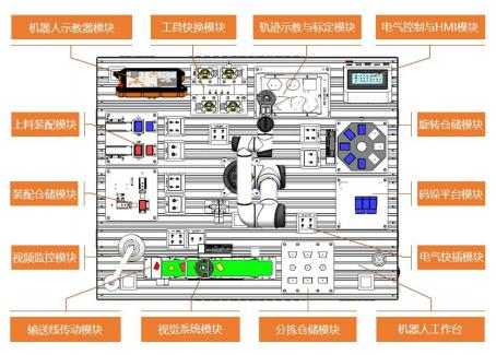 工作臺(tái)整體由兩個(gè)基礎(chǔ)臺(tái)拼接而成,更具空間靈活,拆卸方便等特點(diǎn)。臺(tái)面采用標(biāo)準(zhǔn)鋁型材,機(jī)器人 及功能模塊可根據(jù)需求改變布局位置,所有功能模塊采用手?jǐn)Q螺栓方式固定,可實(shí)現(xiàn)無(wú)工具快速拆裝與更 換。每個(gè)模塊電氣部分配置了獨(dú)立的電氣接線盒和快速航插,可實(shí)現(xiàn)模塊整體機(jī)械和電氣快速安裝部署, 還可根據(jù)需求更換或添加功能模塊進(jìn)行功能擴(kuò)展。