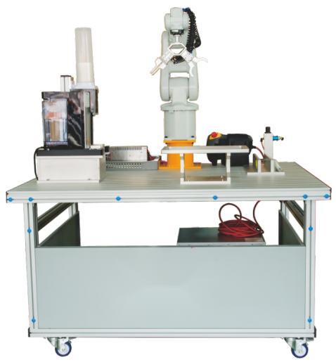 該裝置采用鋁木結(jié)構(gòu)試訓(xùn)臺(tái),由實(shí)訓(xùn)桌、飲水機(jī)(自動(dòng)售賣機(jī))、取杯器、工業(yè)機(jī)器人(帶復(fù)合手爪),底座(支架)等幾個(gè)部分組成,利用工業(yè)機(jī)器人完成茶藝流程一系列的動(dòng)作。該設(shè)備圍繞工業(yè)機(jī)器人展開(kāi)內(nèi)容,從通訊、機(jī)械、電氣三方面突出顯示其在服務(wù)業(yè)中的運(yùn)用,為學(xué)習(xí)自動(dòng)化提供全面教學(xué)便利。