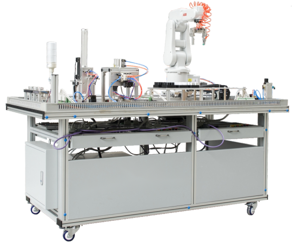 LGY-JY011A型智能制造工作站實(shí)訓(xùn)設(shè)備主要由安裝在鋁合金導(dǎo)軌式實(shí)訓(xùn)臺(tái)上的送料單元、加工單元、軌跡單元、搬運(yùn)單元和碼垛單元5個(gè)單元組成。電氣布局采用雙抽屜式,所有其電氣控制器都安裝在網(wǎng)孔板式的抽屜上,這種機(jī)電分離的格式跟加符合了工業(yè)實(shí)際情況,在控制方面,該設(shè)備配置采用了基于RS485串行通信的PLC網(wǎng)絡(luò)控制方案,各PLC之間通過(guò)RS485串行通訊實(shí)現(xiàn)互連的分布式控制方式,外觀如上圖所示。該設(shè)備涵蓋了機(jī)電一體化或電氣自動(dòng)化專(zhuān)業(yè)學(xué)習(xí)中所涉及的如工業(yè)機(jī)器人應(yīng)用與維護(hù)、機(jī)電控制技術(shù)、氣動(dòng)控制技術(shù)、過(guò)程控制技術(shù)、可編程控制技術(shù)、自動(dòng)檢測(cè)技術(shù)、運(yùn)動(dòng)控制技術(shù)、網(wǎng)絡(luò)通信技術(shù)、人機(jī)界面等多項(xiàng)技術(shù),具有職業(yè)性、實(shí)踐性、開(kāi)放性、產(chǎn)業(yè)性、教學(xué)性、通用性等特點(diǎn),是一套能用于職業(yè)技能的訓(xùn)練、培訓(xùn)、考核及技能大賽的實(shí)訓(xùn)設(shè)備。