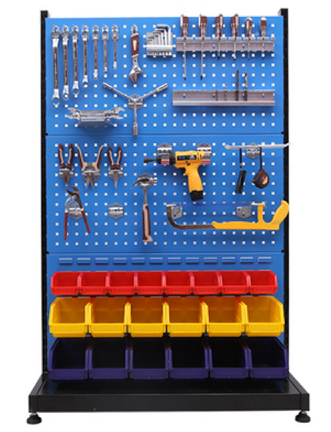工具架采用3層掛板工具架,立柱采用2.0mm優(yōu)質(zhì)矩形管,掛板采用1.5mm冷軋鋼板制作;掛板為藍(lán)色,立柱和底板為黑色,配置鋁合金手柄,方便移動(dòng),能夠完成工具的有序掛置與存放,充分利用空間,整潔高效率,環(huán)保無毒。配置專用掛鉤,整體尺寸為:960*375*1450mm(長(zhǎng)寬高)。