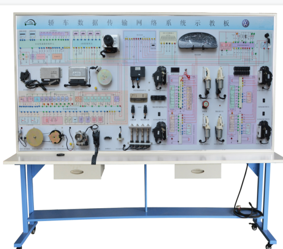 3、系統(tǒng)正常工作,各電器零部件布置在示教板上,在示教板上繪制了CAN總線的線路圖,上面布置了4mm的測(cè)量端子;