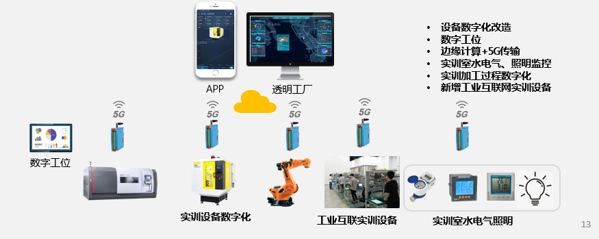 該平臺(tái)可對(duì)原有實(shí)訓(xùn)室生產(chǎn)線(xiàn)進(jìn)行數(shù)字化改造,把傳統(tǒng)設(shè)備升級(jí)為數(shù)字化設(shè)備,對(duì)數(shù)控機(jī)床、機(jī)器人、PLC和自動(dòng)化生產(chǎn)線(xiàn)等實(shí)訓(xùn)室進(jìn)行智能化改造。利用傳感器、邊緣計(jì)算、大數(shù)據(jù)和工業(yè)互聯(lián)網(wǎng)技術(shù)改造實(shí)訓(xùn)室的實(shí)訓(xùn)設(shè)備和教學(xué)基礎(chǔ)設(shè)施,實(shí)現(xiàn)遠(yuǎn)程監(jiān)視、遠(yuǎn)程控制、遠(yuǎn)程維護(hù)、多設(shè)備協(xié)同、生產(chǎn)管理等功能。在每臺(tái)設(shè)備上加裝一套數(shù)字化改造套裝,有邊緣計(jì)算網(wǎng)關(guān)和數(shù)字工位量部分組成。