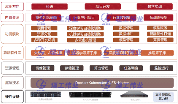 數(shù)智化產(chǎn)學(xué)研協(xié)同平臺(tái)采用B/S架構(gòu),利用先進(jìn)的云計(jì)算、大數(shù)據(jù)和人工智能理念,搭建面向人工智能和大數(shù)據(jù)教育的產(chǎn)學(xué)研一體化平臺(tái),產(chǎn)品將對(duì)教學(xué)資源、開(kāi)發(fā)環(huán)境和工具、開(kāi)發(fā)流程、算法資源、虛擬化支撐云平臺(tái)和硬件資源進(jìn)行整合和重建,從高校教學(xué)管理者、專業(yè)負(fù)責(zé)人、課程負(fù)責(zé)人、教師和學(xué)生等多緯角度上,打造專業(yè)化人才定制培養(yǎng)服務(wù)平臺(tái)。