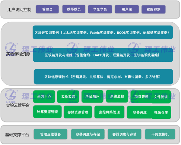 區(qū)塊鏈實(shí)驗(yàn)教學(xué)平臺(tái)的的產(chǎn)品設(shè)計(jì)由下而上分為四層,即:基礎(chǔ)支撐平臺(tái)、實(shí)驗(yàn)云管平臺(tái)、實(shí)驗(yàn)課程資源、用戶訪問控制。